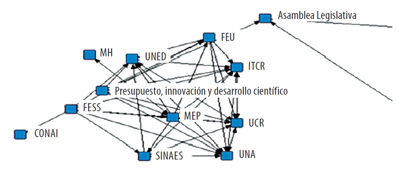 El MICITT coordina una agenda con otros actores que se aprecian en el Grafo 4. Se reconoce en el acta legislativa que los presupuestos disponibles son “impresionantemente bajos (…) la preocupación es ¿cómo podemos fortalecer esta área del desarrollo? Porque Costa Rica, como país, no va a poder llegar realmente a un desarrollo pleno y valioso sino tenemos una inversión mayor” (Asamblea Legislativa, 2010, p. 6).