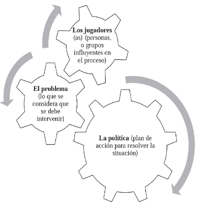 Dichos componentes se sitúan en una relación de interdependencia y en un contexto determinado “la característica más importante de la actividad de formulación de políticas es que se trata de un proceso que ocurre en un contexto” (Smith, 2005, p. 1) [Traducción propia.], sumado a como lo presenta la Figura 2, cada engranaje puede tener un relativo peso mayor o menor, que los demás, aún así, dependen entre sí.