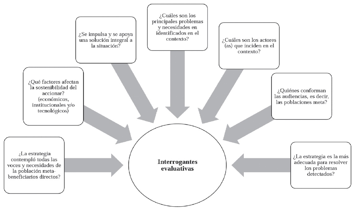 Desde el enfoque de la evaluación como transformación, es oportuno describir las siguientes interrogantes, que se detallarán por medio de la Figura 5, para denotar ejemplos de interrogantes evaluativas, que deben ser considerados en los procesos de formulación, ejecución evaluación de las políticas públicas, programas, proyectos4 para lograr reflexividad.