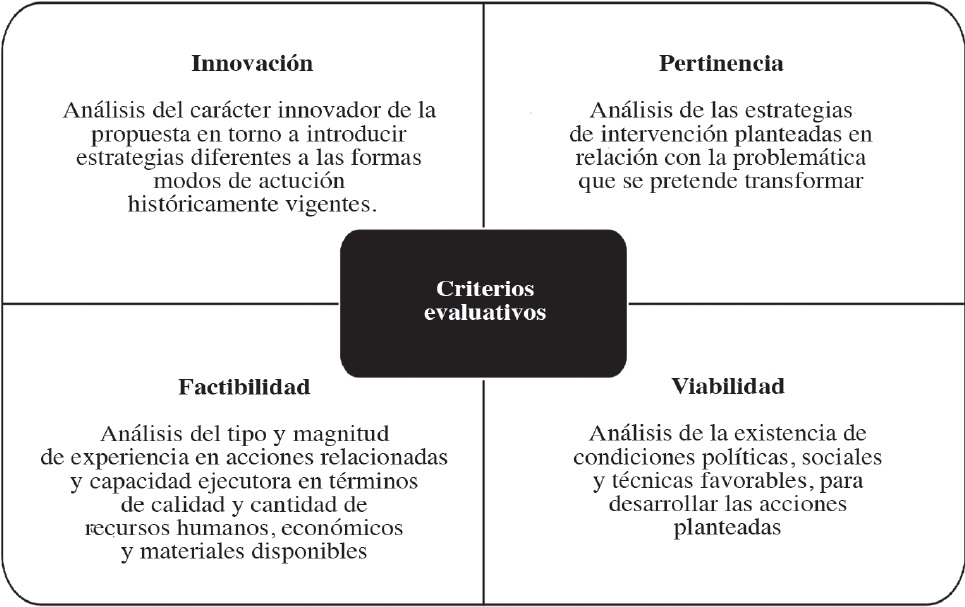Se trata de establecer la pertinencia de la propuesta: la adecuación de las intervenciones que propone a la realidad que se pretende modificar; su coherencia interna en cuanto a la adecuación de recursos a actividades y de estas a metas y objetivos y su factibilidad, o sea, la capacidad de la institución ejecutora para llevarla a cabo en términos de la calidad y cantidad de recursos humanos, económicos y materiales disponibles, así como su viabilidad en función de la existencia de condiciones políticas, sociales y técnicas favorables, para desarrollar las acciones planteada (Nirenberg, 2003, p. 103-104).