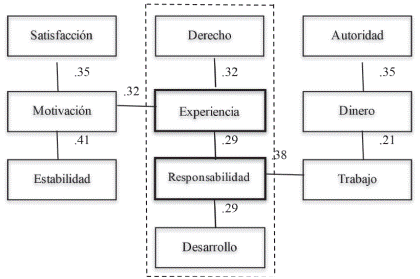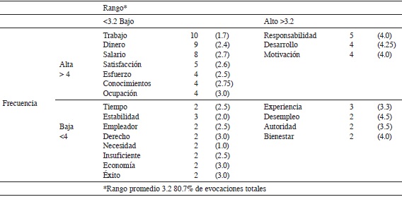 En las RS de empleo el rango de evocación retenido fue del 80.7%, y el rango promedio fue de 3.2. Los términos ubicados en una frecuencia alta (>4) y un rango bajo (<3.2) son los que constituyeron el núcleo central de las RS de empleo: aspectos económicos (dinero, salario), términos asociados (trabajo, ocupación), requisitos (esfuerzo, conocimientos). Los términos ubicados en la segunda columna con frecuencia baja (<4) y rango alto (>3.2) son considerados parte del sistema periférico de las RS, se caracterizan por estar determinados por la historia individual de las personas y por sus experiencias particulares: aspectos asociados (desempleo), un requisito (experiencia) y efectos personales (bienestar, autoridad).