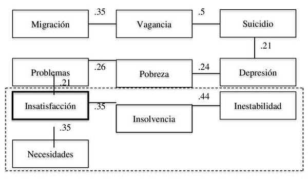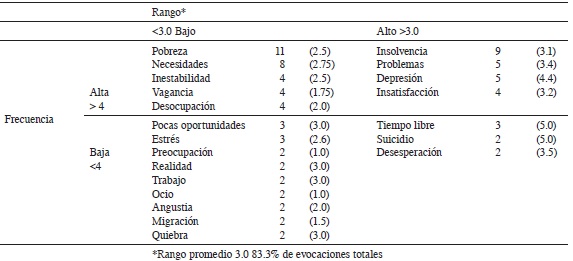 En las RS de desempleo el rango de evocación retenido fue del 83.3%, y el rango promedio fue de 3.0. Los términos ubicados en una frecuencia alta (>4) y un rango bajo (<3.0) son los que constituyen el núcleo central de las RS de desempleo. Se ubicaron en este espacio a términos de tipo económico (pobreza, necesidades), asociados (desocupación), efectos personales (inestabilidad) y un efecto social (vagancia). Los términos ubicados en la segunda columna con frecuencia baja (<4) y rango alto (>3.0) fueron considerados el sistema periférico de las RS, que sólo incluyó un término asociado (tiempo libre) y efectos personales (suicidio, desesperación).