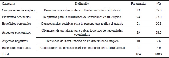 Las categorías que incluyen más términos fueron los componentes de empleo (ocupación, trabajo, empleador, organización, empresa, etc.), elementos necesarios (experiencia, motivación, responsabilidad, suerte, etc.) y beneficios personales (futuro, estabilidad, bienestar, independencia, etc.). La categoría de componentes del empleo incluyó sinónimos (trabajo, ocupación, un joven indicó: “permite que la persona se desarrolle en el área laboral permitiendo un intercambio remunerativo por la realización de la tarea”). Elementos de una organización (empleador, empresa, trabajador, organización y uniforme), un antónimo (desempleo) y la palabra derecho (“todos podemos ejercer libremente el trabajar, sin que nada de índole legal lo prohíba”). En la categoría de elementos necesarios se incluyeron aspectos personales, (responsabilidad, compromiso, esfuerzo: “requiere del trabajo de las personas y el sacrificio para realizarlo”), motivaciones (deseos de superación, gusto: “es importante realizar tareas que sean agradables y afines a todo lo que he estudiado, ya que así serán realizadas de mejor manera”), académicos (conocimientos, experiencia: “el laborar y realizar las diferentes actividades nos ayuda a aprender muchas cosas, el conocer nuevas estrategias”) y externos como suerte (“es cuestión de tener una palanca o alguien asertivo de la organización para que pueda colaborar”). Y en la categoría de beneficios personales se citaron efectos emocionales (tranquilidad, satisfacción: “puedo cumplir con las metas personales y profesionales planificadas”), bienestar (“estabilidad emocional y económica para mi sustento diario”), superación (desarrollo, dignidad, independencia: “ya no dependería económicamente de mis padres, sino que yo administraría mi dinero”), material (comodidad, éxito, logros) y futuro (“trabajaré mi futuro con un empleo y me abriré oportunidades de crecimiento”).