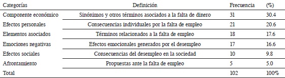 En la Tabla 3 se muestran las categorías encontradas en el análisis de las palabras obtenidas en los listados libres para las RS de desempleo, en los participantes.