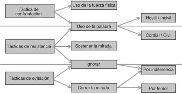 Las distintas formas de proceder del estudiantado las hemos agrupado en las siguientes categorías empezando por las de menor confrontación hasta aquellas que llegan al uso de la fuerza física: a) tácticas de evitación, b) tácticas de resistencia y, c) tácticas de confrontación. (Figura 1)