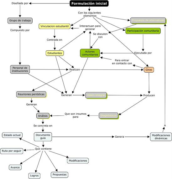 En la Figura 1 se presenta un esquema general de la estructura de trabajo, así como de las diversas interacciones entre los elementos que la componen. El punto de partida es una formulación inicial del proyecto, basada en lo descrito en el apartado anterior y en el conocimiento previo que se tenía de las comunidades. Tal punto de partida; sin embargo, y de acuerdo con la estructura misma de trabajo, es modificable conforme el proyecto avanza, conforme los conocimientos formales aportados por el equipo inicial se constituyen en conocimientos contextualizados gracias a la interacción y construcción que se realiza con las comunidades.