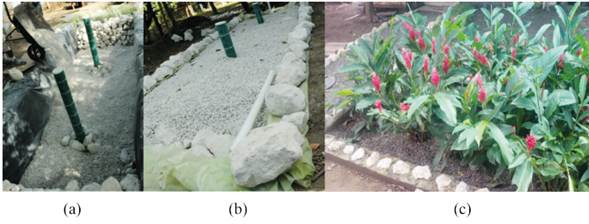 Un ejemplo adicional consiste en las sugerencias de modificación en ciertos aspectos del diseño, como el método para colocar las piedras en la periferia de las biojardineras (Figura 2, a y b), ya que una de las personas de la comunidad sugirió cambios de tal manera que el resultado final tuviera la misma funcionalidad pero fuera superior en lo que respecta a la estética. Esto, desde el punto de vista de la Ingeniería, no suele tener valor alguno; sin embargo, cuando el producto final posee características más allá de su funcionalidad, como una estética agradable, este factor puede ser la diferencia entre el éxito y el fracaso en el largo plazo, pues muchas veces las biojardineras son abandonadas por las personas usuarias debido a que no hay un vínculo con ellas, no se consideran un objeto que aporte valor.