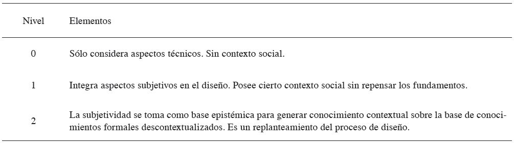 Con el objetivo de categorizar los procesos de diseño de sistemas de tratamiento de residuos, se proponen tres categorías, como se muestra en el Cuadro 1, dichas categorías dividen los procesos de diseño en tres niveles en función del grado de inclusión de la subjetividad. Los niveles 0 y 1 son los que ya se han discutido, en los que se realiza el diseño sin tomar en cuenta otros aspectos más que las variables físico-químicas (0) o agregando variables socio-económicas (1). Se propone un nuevo nivel (2), en el cual se replantea el proceso de diseño, se descolonializa al tomar los conocimientos formales (los utilizados por los niveles 0 y 1) y con ellos, por medio de una participación activa del grupo social para el cual se diseñará el sistema de tratamiento, se construye nuevo conocimiento, una amalgama entre los saberes técnico-científicos formales y los saberes del grupo social, proporcionados por su experiencia de vida.