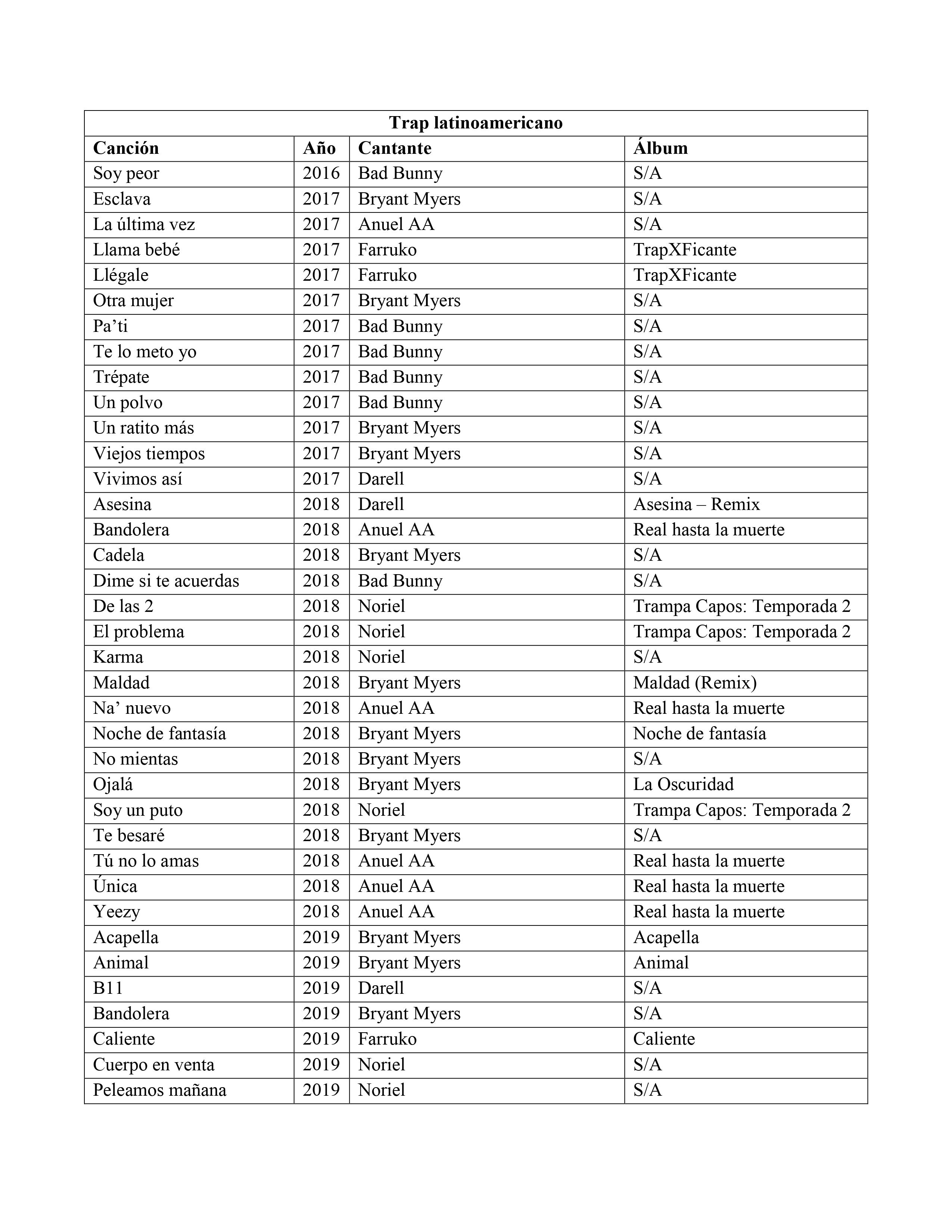 Music has become an object of study in Social Sciences, where its relationship with the type of society, in which its process of creation and consumption is framed, is emphasized. In this context, Latin American trap represents a field of study that allows to analyze the manifestations of violence against women.