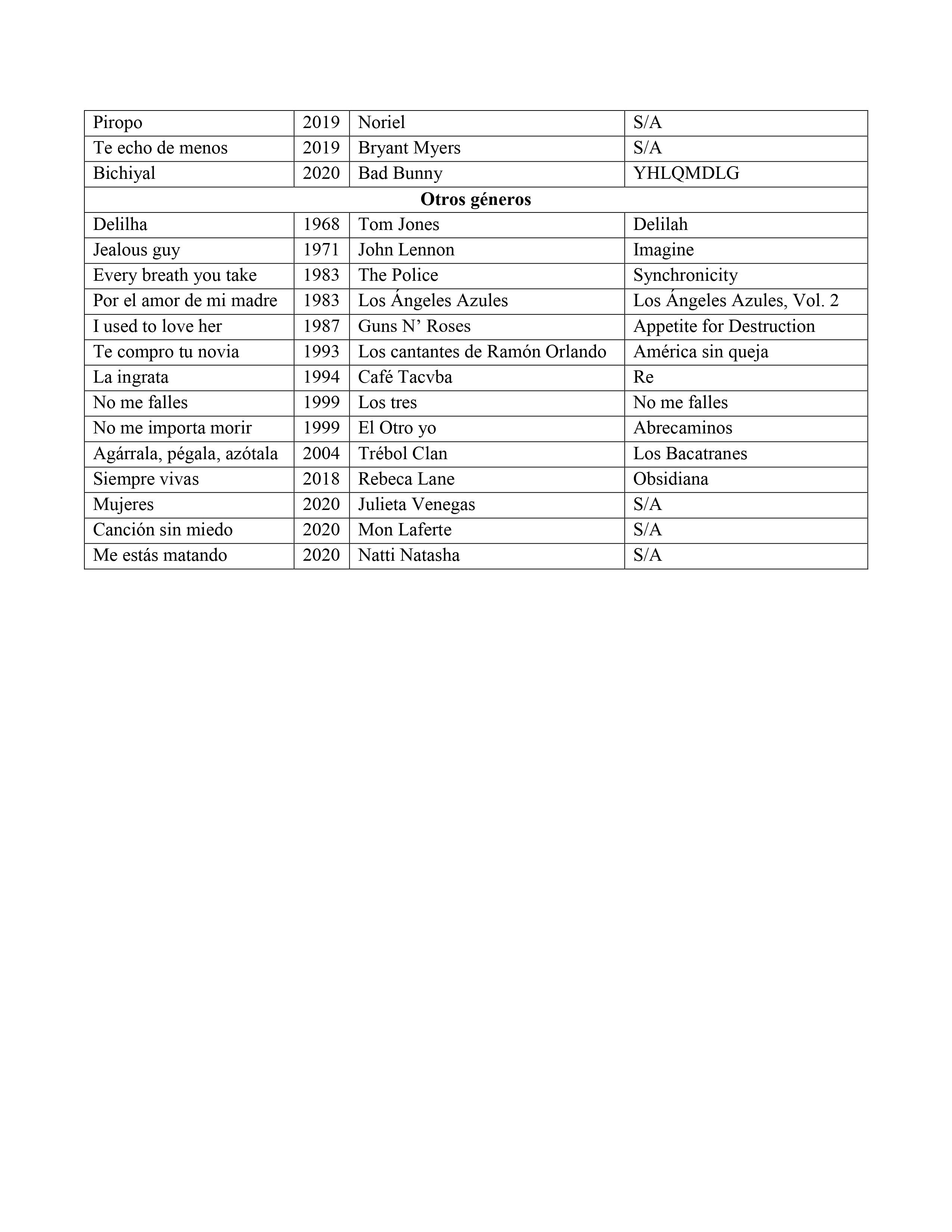 Anexo 1. Lista de canciones mencionadas en el artículo (Ordenadas alfabéticamente por año)