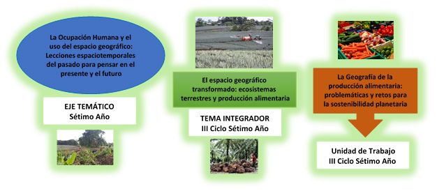 En sétimo nivel de la educación secundaria, los contenidos del programa permiten localizar las principales problemáticas socioambientales de la producción de alimentos en Costa Rica. Para esto, se usa un análisis de escalas multivariado que permite visibilizar «dinámicas glocales» influyentes en la demanda de recursos naturales y socioeconómicos de movilización de capital para abastecer esta actividad (Harvey 2007, 245-247; Pillet Capdepón 2008, párr. 2). El abordaje educativo de este fenómeno se puede realizar recurriendo a estudios académicos, información censitaria y geográfica encontrada en la prensa, con el fin de propiciar espacios de transposición didáctica en el aula.