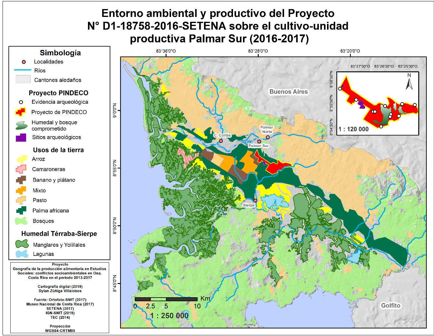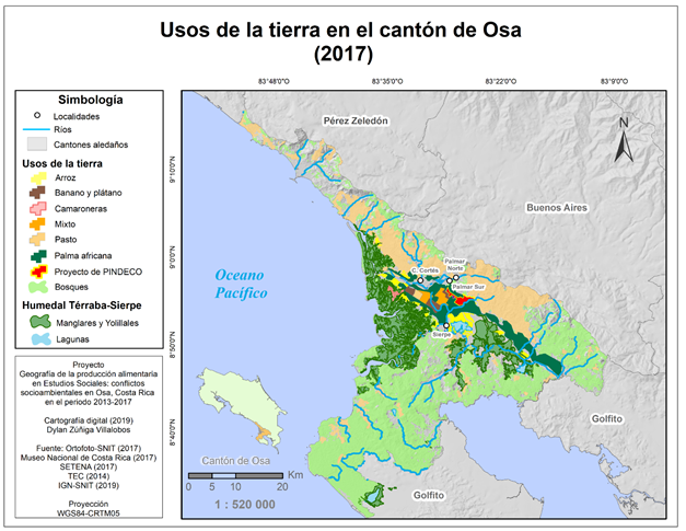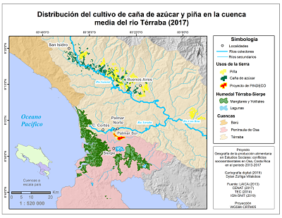 De este modo, se recurre al uso de la cartografía temática para situar la distribución de los usos de la tierra a nivel cantonal y así propiciar una indagación de las principales características del proyecto Nº D1-18758-2016 SETENA de la concesionaria PINDECO en Palmar Sur. También se evidencian las eventuales implicaciones ambientales que supondría las afectaciones ecosistémicas al Humedal Térraba-Sierpe, debido al aumento del área de ocupación de producción agrícola y el transporte de sustancias residuales del proceso de producción de piña y banano.
