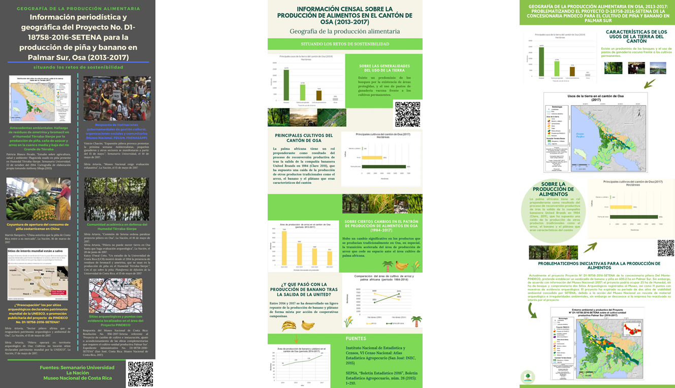 El interés central de este artículo surge de la intención didáctica de problematizar proyectos para la producción de alimentos en un entorno concreto. Para este caso, se recurre el espacio local del cantón de Osa durante el período 2013-2017, debido al desarrollo del conflicto socioambiental producido por el proyecto Nº D1-18758-2016-SETENA de la concesionaria PINDECO (Del Monte). Esta empresa buscaba establecer un sembradío de piña y banano en el distrito de Palmar Sur, con un área de producción de 600.2 hectáreas y a escasos 5 kilómetros de distancia del Humedal Térraba-Sierpe. Esto aumenta la presión ambiental sobre este ecosistema y permite abordar didácticamente la complejidad espacial de ese conflicto con mayor claridad.