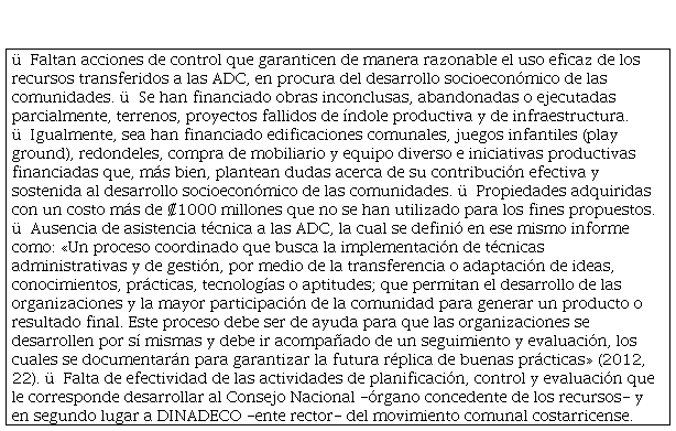 Asimismo, la Contraloría General de la República (CGR) ha emitido tres informes de fiscalización en el periodo 2011-2017, con el objetivo de determinar el verdadero impacto de los recursos girados a las ADC en el desarrollo de Costa Rica. De esta forma, si bien se deja entrever un interés gubernativo por apoyar las acciones de las comunidades en la búsqueda de su propio desarrollo a través de una vía que sí cumple con el precepto de una mejor distribución de la riqueza, igualmente se percibe un afán –justificable o no desde la perspectiva de las posibilidades tributarias del gobierno– por constreñir dicha vía, lo que conlleva la necesidad de sopesar más minuciosamente esa realidad, a fin de precisar la conveniencia o no de continuar con ese apoyo comunal desde las arcas del Estado.