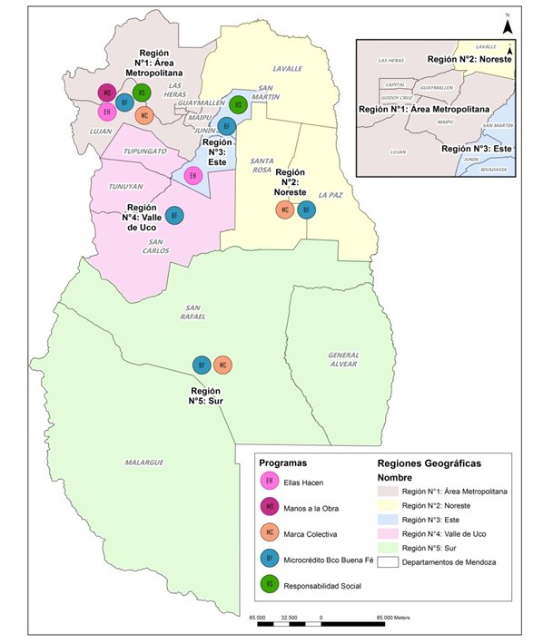 En el análisis de la política social Argentina Trabaja en Mendoza se observa que de los 10 programas de dicha política solo se implementaron de forma continua y con seguimiento los cinco programas que están cartografiados más el Monotributo Social. Los mismos se aplicaron en conjunto con diferentes actores territoriales, el Centro de Referencia del MDS de Nación y los municipios. Sin embargo, en los programas Compremos lo Nuestro . Emprendedores de Nuestra Tierra, el CDR actuaba como articulador entre quienes emprendían y las demandas para ferias o eventos que solicitaban desde Nación. Asimismo, la mayoría de los programas se aplicaron en la región metropolitana de Mendoza.