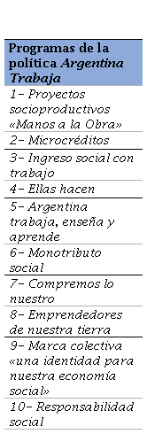 La política social Argentina Trabaja comenzó a implementarse en el año 2010 como una readecuación del Plan Manos a la Obra mediante la Resolución 2476/2010 - MDS. Desde sus inicios fue denominada por el Gobierno nacional como una política de Economía Social y Desarrollo Local y estaba conformada por 10 programas que se desplegaron en todo el territorio argentino (véase Tabla 1). El Ministerio de Desarrollo Social sostenía que «la política social era parte de la política económica, y [que] se desplegaba en todo el territorio nacional un plan de Economía Social, que desde el fomento y fortalecimiento de las cooperativas, emprendimientos productivos y talleres familiares, facilitaba el acceso al trabajo» (MDS 2010, 12).