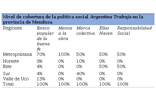 La implementación de la política social Argentina Trabaja en la provincia de Mendoza presenta una fuerte concentración de los programas en la región Metropolitana. Dicha concentración no contribuye a una perspectiva de ESyS como una forma de organizar económicamente el territorio a partir de la aplicación de los principios socio-económicos, sino que queda fragmentada en la aplicación de cada programa con una concepción de ESyS para los sectores vulnerados.