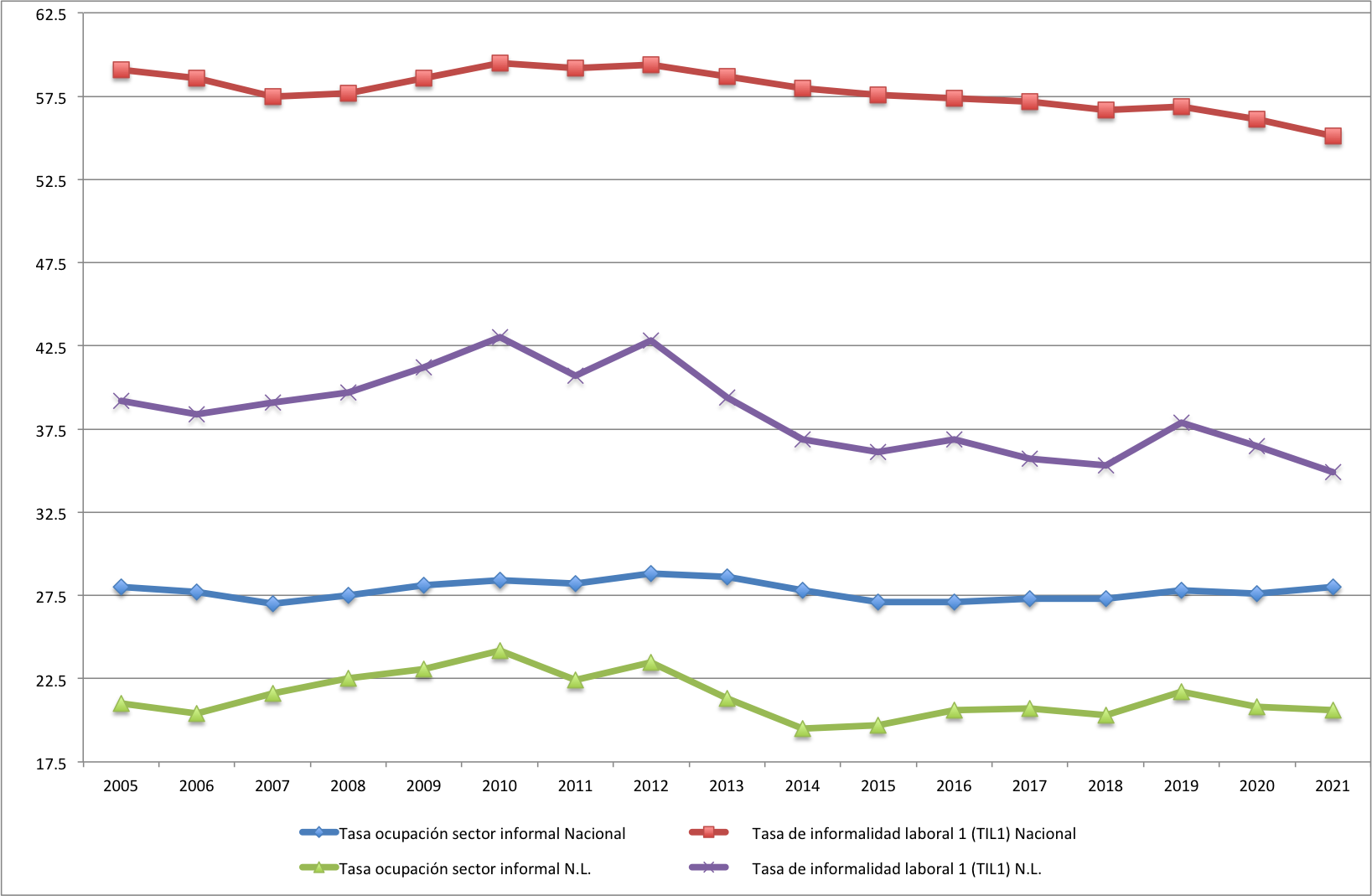Según el INEGI (2020), la tasa de ocupación en el sector informal se refiere al sector de la población ocupado en unidades económicas operadas sin registros contables y que funcionan a partir de los recursos del hogar o de la persona que encabeza la actividad sin que se constituya como empresa. De modo que la actividad en cuestión no tiene una situación identificable e independiente de ese hogar o de la persona que la dirige y que, por lo mismo, tiende a concretarse en una muy pequeña escala de operación. Mientras que la tasa de informalidad laboral es la proporción de la población ocupada que es laboralmente vulnerable por la naturaleza de la unidad económica para la que trabaja, con aquellos cuyo vínculo o dependencia laboral no es reconocido por su fuente de trabajo. Se incluyen, además del componente que labora en micronegocios no registrados o sector informal, a otras modalidades análogas, como los ocupados por cuenta propia en la agricultura de subsistencia, así como a personas trabajadoras que laboran sin la protección de la seguridad social y cuyos servicios son utilizados por unidades económicas registradas (INEGI 2020). La tasa de ocupación en el sector informal es lo más cercano a las definiciones clásicas de informalidad, mientras que la tasa de informalidad laboral es una versión más ampliada que, de hecho, representa mayores porcentajes de la población ocupada.