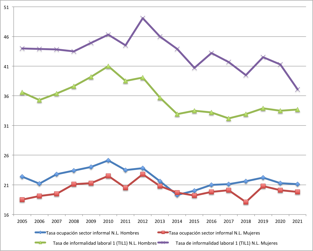 En el caso de Nuevo León, la tasa de ocupación en el sector informal es más alta para los hombres que para las mujeres, con excepción del año 2014, donde fue 0.4 puntos porcentuales mayor para las mujeres. Al primer trimestre del 2021, este indicador fue de 21.1% para los hombres y de 19.8% para las mujeres, una diferencia de 1.3 puntos porcentuales. En el caso de la tasa de informalidad laboral (TIL1) sucede lo contrario, siendo más alta para las mujeres, debido a que esta medición incluye el trabajo doméstico remunerado, el cual según la misma ENOE es llevado a cabo en un 90% por mujeres. Para Nuevo León, al primer trimestre del 2021, este indicador fue de 37.1% para las mujeres y de 33.7% para los hombres, una diferencia de 3.4 puntos porcentuales, la cual se ha venido cerrando desde el 2014, cuando dicha diferencia alcanzó un máximo de 11 puntos. Llama la atención, aunque este indicador cayó visiblemente durante el primer trimestre del 2020 y el mismo trimestre del 2021 para las mujeres (4.2 puntos porcentuales), durante el confinamiento por la pandemia, para los hombres incluso aumentó ligeramente (0.2 puntos porcentuales), lo que podría denotar diferencias entre ambos sexos en su participación en el trabajo informal durante la pandemia (Figura 2).