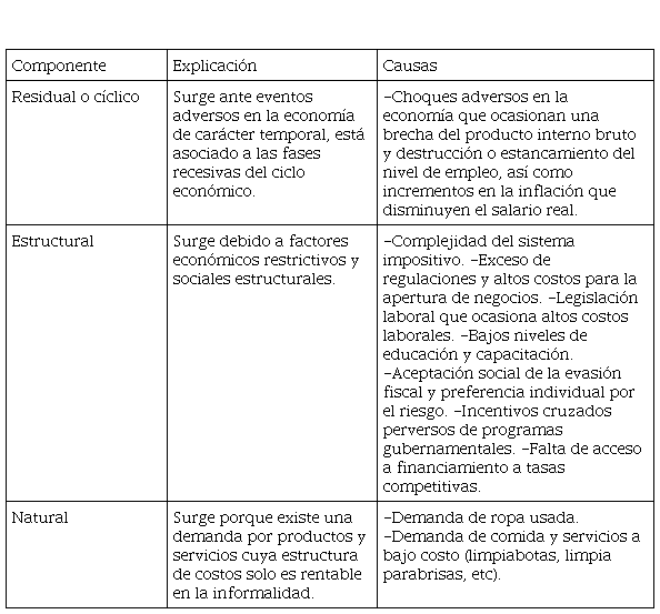 De forma similar a lo que sucede con el desempleo, se puede decir que el comportamiento del sector informal está influenciado por tres componentes, uno residual o cíclico, otro estructural y uno más natural. La parte residual o cíclica del sector informal tiende a crecer durante la fase recesiva del ciclo económico. Sin embargo, aunque la economía se encuentre en una fase expansiva, el sector informal es persistente debido a su componente estructural, ocasionado entre otras cosas por regulaciones gubernamentales que implican costos de cumplimiento y un componente natural, compuesto por actividades que solo son rentables en la informalidad (Rubio 2012). La formalización del empleo tiene que ver con atacar los tres diferentes componentes de la informalidad, a fin de desincentivar, sobre todo, las causas del componente estructural que se muestran en la Tabla 1.