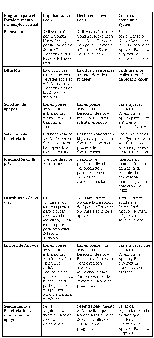 El Modelo general de procesos de la Tabla 2 muestra el funcionamiento de los instrumentos de política pública a partir de la operación de sus procesos. Este modelo permite confirmar, claramente, lo hasta ahora analizado. 1. La planeación de los instrumentos de política pública en el Estado de Nuevo León se lleva a cabo por el sector privado a través de El Consejo Nuevo León. 2. Las cámaras empresariales de las Pymes son las que se encuentran principalmente involucradas en el Consejo, mientras que los micro-negocios tienen poca o nula representación. 3. Los apoyos se otorgan a partir de que las empresas acuden al gobierno a solicitarlos y no hay investigación y desarrollo para fomentar el crecimiento de nuevos sectores productivos. 4. Los apoyos se concentran principalmente en las Mipymes formales o que están en proceso de formalización, pero no se cuenta con un padrón actualizado. 5. El seguimiento y monitoreo se realiza en la medida en que las empresas continúan asistiendo a las oficinas del gobierno de Nuevo León.