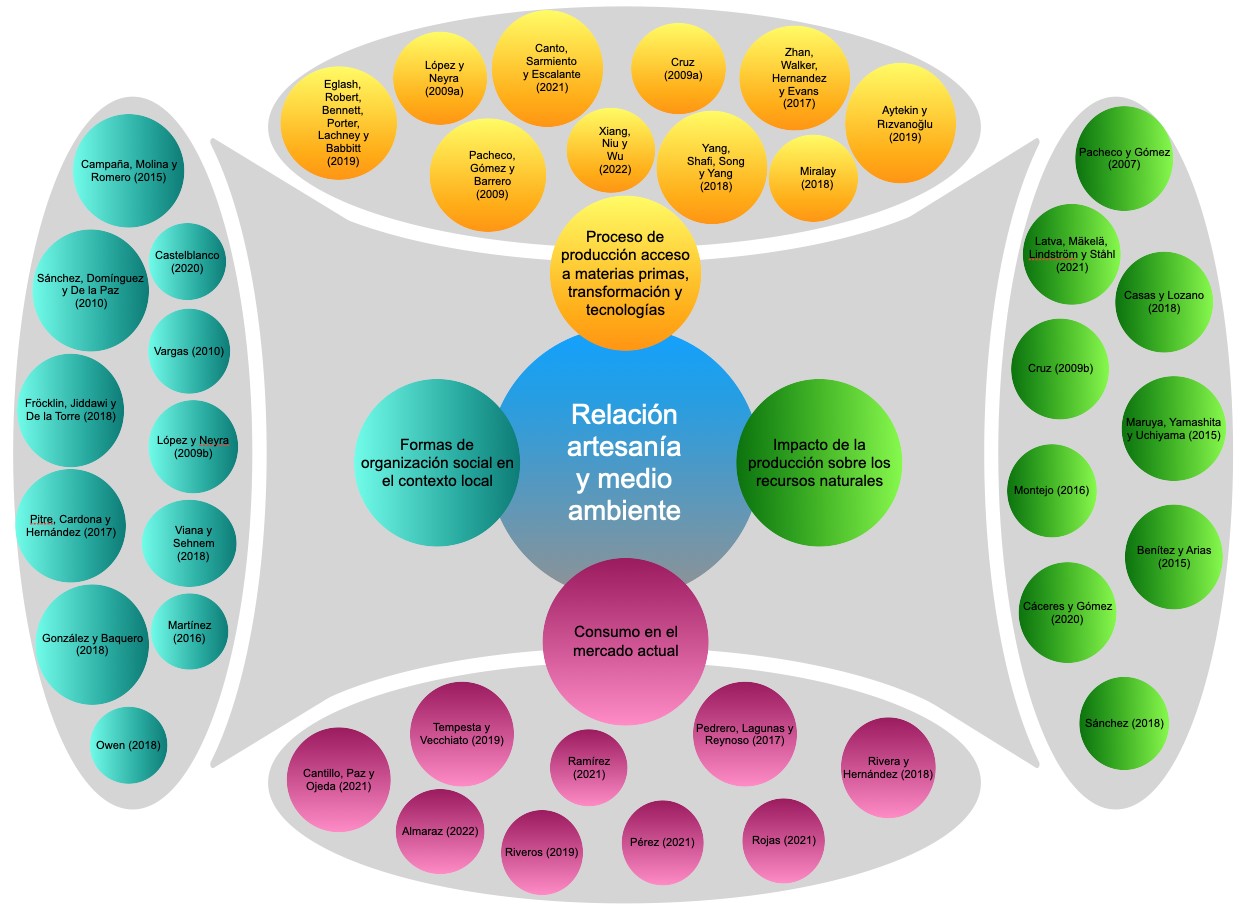 A partir de la identificación y análisis de estudios ambientales sobre la actividad artesanal que se han desarrollado previamente, fue viable identificar cuatro distintas aproximaciones temáticas sobre el objeto de estudio. Es posible representar gráficamente estos trabajos, agrupados en torno al objeto de estudio, los cuales no se presentan como un proceso lineal ni jerárquico, sino como maneras distintas de abordar la realidad.