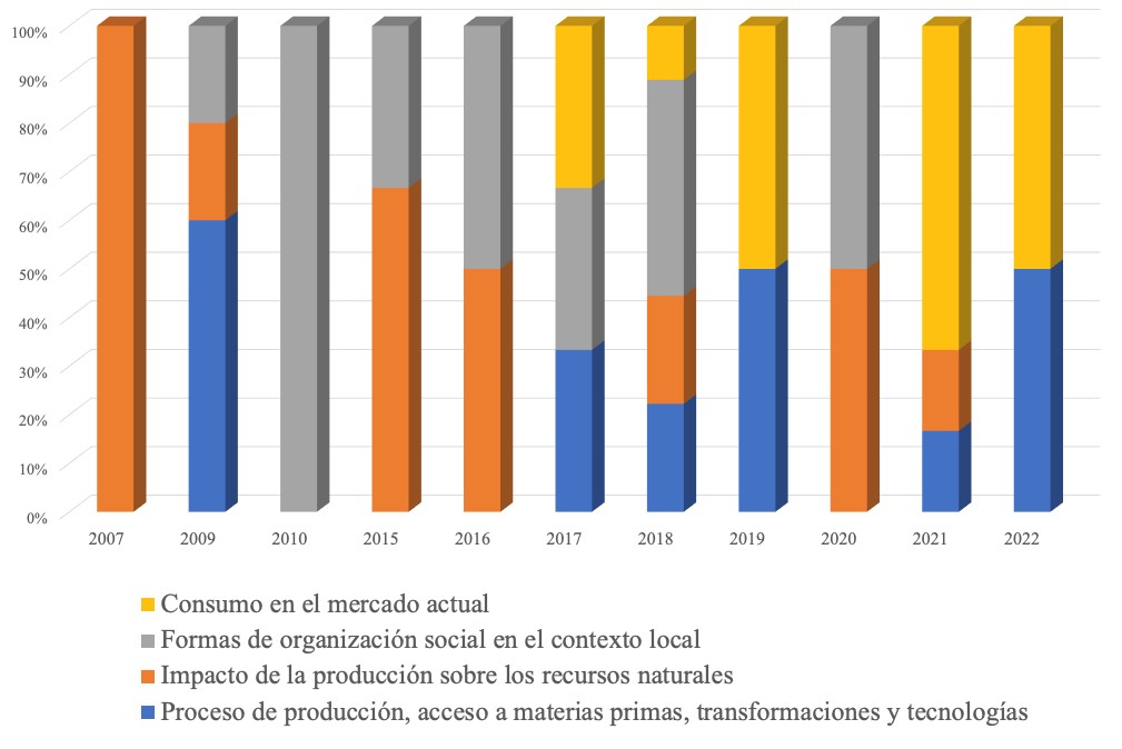 Resultados: Se identificaron cuatro grupos de aproximaciones temáticas: a) proceso de producción, acceso a materias primas, transformación y tecnologías; b) impacto de la producción sobre los recursos naturales; c) formas de organización social en el contexto local; d) comercialización y consumo en el mercado actual.