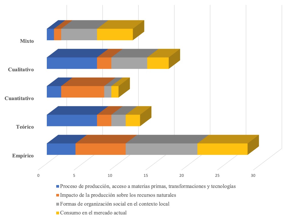 Lo anterior ha dado como resultado la identificación de diversas aproximaciones temáticas, clasificadas en cuatro grupos: a) proceso de producción, acceso a materias primas, transformación y tecnologías; b) impacto de la producción sobre los recursos naturales; c) formas de organización social en el contexto local; y d) comercialización y consumo en el mercado actual.