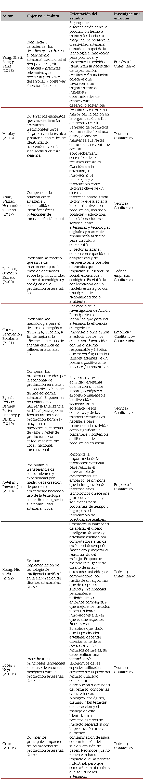 Una vez que fueron seleccionados 39 estudios ambientales sobre la actividad artesanal, se procedió a su análisis mediante los siguientes criterios: a) identificación de puntos de encuentro respecto al tipo de investigación teórica, empírica o teórico-empírica; b) objetivo de la contribución; c) enfoque metodológico cualitativo, cuantitativo o mixto empleado; d) ámbito territorial local, regional o nacional del estudio; y d) la propia orientación temática y disciplinaria para el abordaje a la relación artesanía y ambiente.