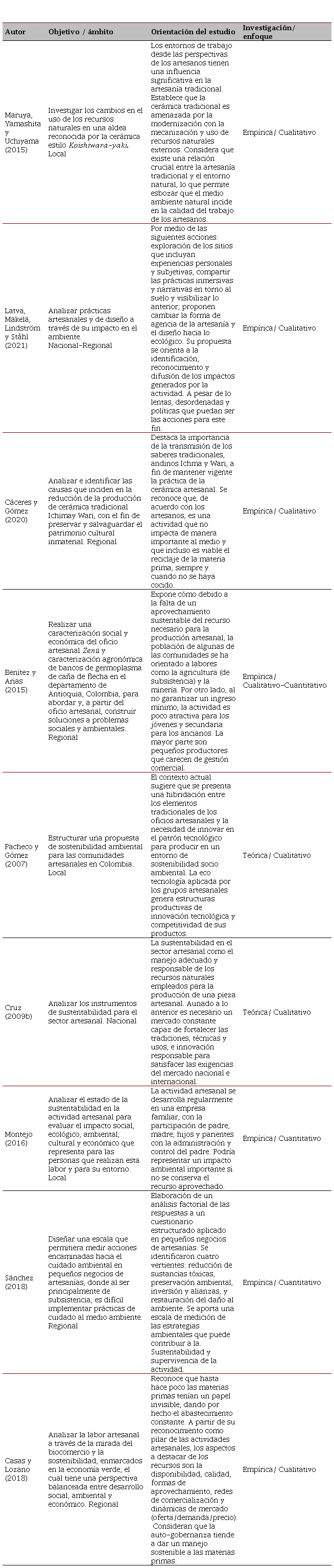 Respecto a los estudios previos que abordan el impacto ambiental de la producción artesanal, se consideraron las contribuciones de Maruya, Yamashita y Uchiyama (2015), quienes analizaron la interrelación que existe entre los artesanos, sus entornos de trabajo y la transformación de las artesanías en la villa de Koishiwara, Japón. Identificaron que, aunque existe una fuerte conexión histórica entre el lugar y las manifestaciones culturales, le permiten convertirse en un atractivo turístico de tipo histórico y cultural, además se han presentado los cambios en el uso de los recursos naturales por parte de la población local para la fabricación de cerámica. Del mismo modo, Latva, Mäkelä, Linsdtröm y Ståhl (2021), consideran que ciertos cambios en la forma en cómo se lleva a cabo la actividad, a partir del diseño o la identificación las experiencias personales, subjetivas y narrativas, pueden contribuir al reconocimiento de los impactos que genera la actividad, que, al ser visibilizados, permitirían la aplicación de acciones para su mitigación.