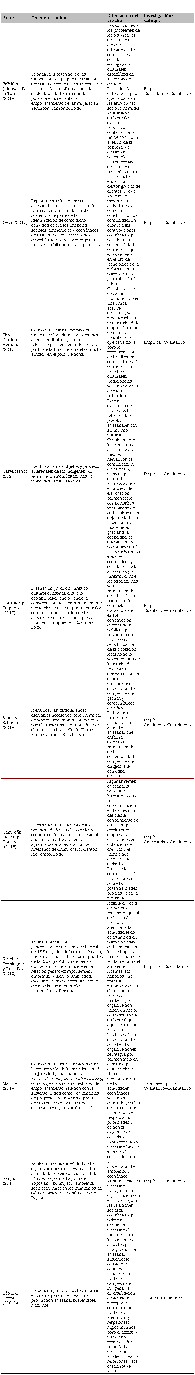 Con relación a los trabajos previos centrados en los actores y formas locales de organización, en particular para el contexto latinoamericano, se observa una fuerte presencia de investigaciones realizadas en Colombia (Benítez y Arias 2015; Pitre et al. 2017) y México (Cruz 2009b; Montejo 2016; Sánchez 2018), con una tendencia a considerar la interrelación entre proceso productivo y organización social, donde la existencia o ausencia de alguno de los elementos impacta de manera negativa a la otra. Existe una vasta cantidad de contribuciones con una perspectiva de administración y negocios, en las cuales se toma a la artesanía como una fuente futura de emprendimiento y trabajo para la población desplazada por la tecnificación industrial.