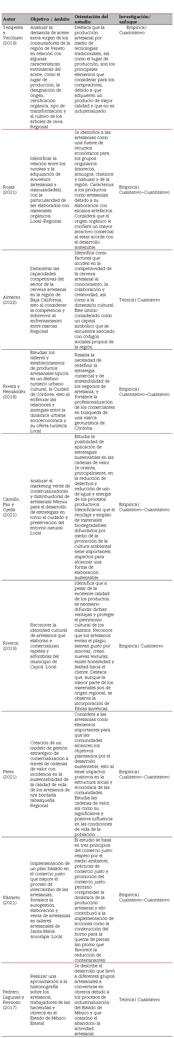 Respecto al tipo de la investigación, la mayor parte de los casos tienen un enfoque cualitativo y empírico. Sin embargo, es evidente que al ser un aspecto que incide en los ingresos de los artesanos, los enfoques mixtos también representan una alternativa necesaria a fin de ahondar en una explicación más amplia de la realidad cuantitativa y cualitativa en cuanto a las condiciones sociales de dicho sector, las cuales tienen un fuerte componente cultural, con repercusiones socioeconómicas que impactan en los ingresos de los artesanos y en su calidad de vida (Tabla 4).