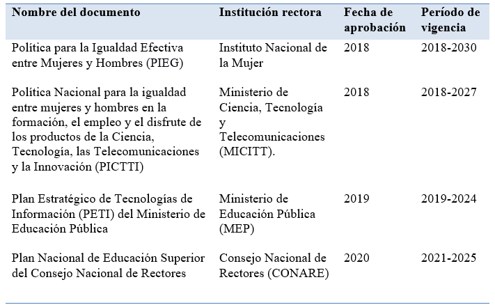 Para la selección de las políticas y los planes se tomaron en consideración elementos que fueran políticas en las que se abordara las TIC desde la perspectiva de género. Entre estos elementos se menciona, en el caso de la PIEG y la PICTTI se trata de políticas emitidas por entidades rectoras en materia de derechos de las mujeres (INAMU) y ciencia y tecnología (MICITT). En cuanto a la selección de los planes, se tomó en consideración el vínculo con la PIEG como con la PICTTI y su relación con las entidades rectoras de la educación pública en el país (MEP y CONARE).