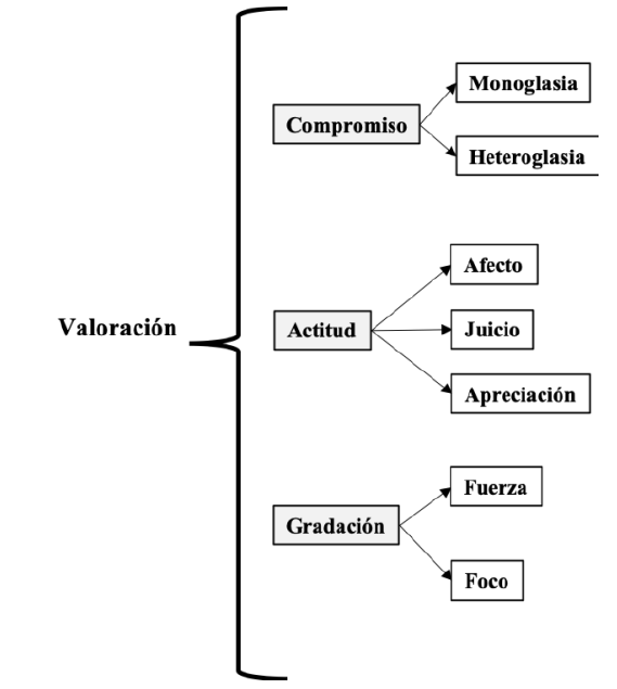 En la valoración del sistema de significaciones sobre la noción del sufrimiento, la Cosmovisión Indígena Bribri revela constantes sobre las instancias valorativas inscritas y evocadas de la «intersubjetividad en el discurso, considerando de manera conjunta la expresión de significados epistémicos e interpersonales» (Oteiza y Pinuer 2019, 213). Se analizaron los textos a partir de los subsistemas de valoración de: actitud, gradación y compromiso; del Modelo de Valoración de Martin y White (2005), el cual se puede observar en la Figura 1: