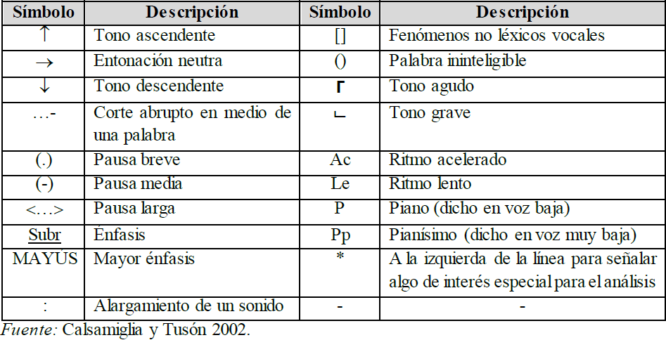 Para ello, se seleccionaron los fragmentos en las entrevistas que respondían a esta pregunta. Cada fragmento fue transcrito, nuevamente, a través de la siguiente simbología observable en la Tabla 1: