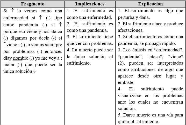 En el siguiente fragmento, las implicaciones del texto ofrecen la posibilidad de situar que la vivencia del sufrimiento tiene tres connotaciones de sentido: 1. el sufrimiento como un dolor y un sentir muy profundo, 2. la diferenciación entre un sufrimiento externo y un sufrimiento interno y 3. la vivencia del sufrimiento de forma comunitaria.
