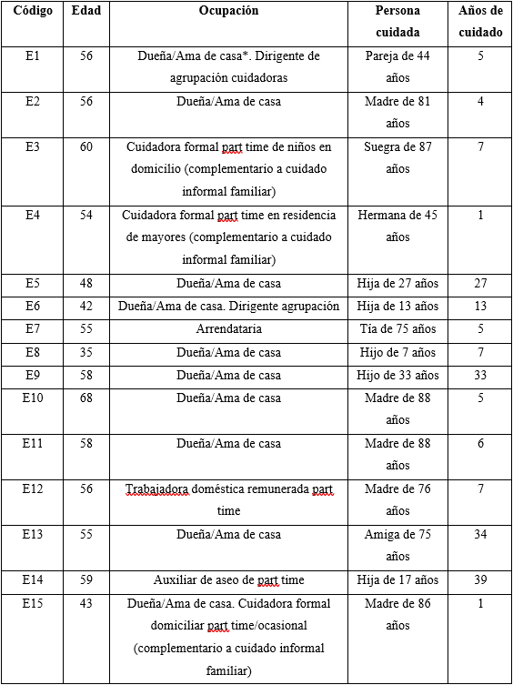 Método: Sosteniéndose en una perspectiva epistemológica interpretativa de tipo exploratorio-descriptivo y método cualitativo narrativo, se realizan 15 entrevistas activas a cuidadoras informales de personas dependientes.
