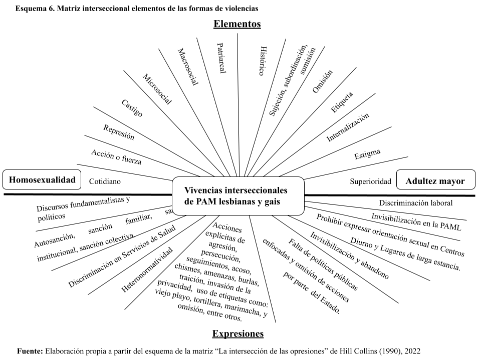 Esta matriz se construye a partir de dimensiones como la orientación sexual (homosexualidad) y la edad (adultez mayor), sobre las vivencias interseccionales de las personas adultas mayores lesbianas y gais. De manera intersecada las vivencias contienen los elementos de la violencia identificados, los cuales son: el patriarcal, histórico, sumisión, subordinación, sujeción, omisión, etiqueta, internalización, estigma, superioridad, microsocial, macrosocial, el castigo, la represión, acción o fuerza y cotidiano. Las diferentes formas de violencia existentes son legitimadas, internalizadas y naturalizadas en la sociedad debido a los diferentes elementos interseccionados que entre sí producen, reproducen y sostienen las diferentes formas y expresiones de violencia.