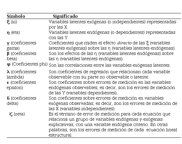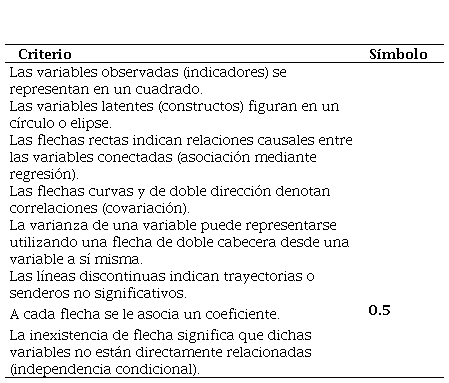 Asimismo, para efectos de la diagramación de dichas variables y el establecimiento de las posibles relaciones entre ellas, es importante considerar la siguiente simbología presente en la Tabla 1, con el objetivo interpretar adecuadamente los gráficos resultantes de un MEE (Cea D’Ancona 2002; García Veiga 2011):