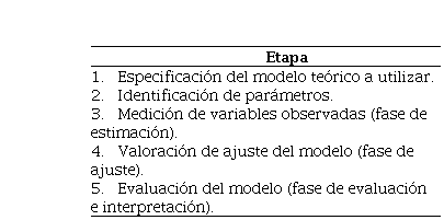 De acuerdo con Casas Guillén los MEE analizan las relaciones causales y no causales entre distintas variables por medio de indicadores de medida de los constructos (o factores) identificados teóricamente, en donde la persona investigadora diseña un modelo que intenta representar de forma sencilla las relaciones existentes entre las variables latentes y observadas. «La hipótesis de partida de todos estos modelos es que reproducen exactamente la estructura de varianzas y covarianzas de las variables objeto de estudio» (2002, 3), siguiendo una metodología que pasa por diferentes etapas: especificación, identificación, estimación de parámetros, evaluación del ajuste, reespecificación del modelo e interpretación de resultados (Tabla 3).