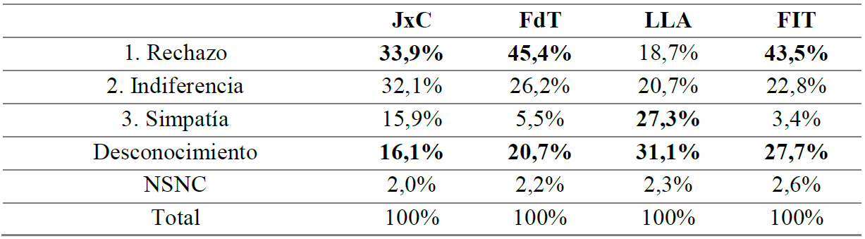 elaboración propiaLa Tabla 2 presenta los resultados para la polarización afectiva por espacios partidarios. Se observa que el rechazo político es el mayor resultado en todos los espacios, excepto en LLA. En JxC el rechazo político es de 33,9%, la indiferencia política del 11,2% y la simpatía política de 15,9%. En FdT el rechazo es 45,4%, la indiferencia 26,2% y la simpatía 5,5%. En FIT el rechazo es 43,5%, la indiferencia 22,8% y la simpatía del 3,4%. En cambio, en LLA el rechazo político es de 18,1%, mientras que la simpatía política es del 27,3%, y la indiferencia del 20,7%.