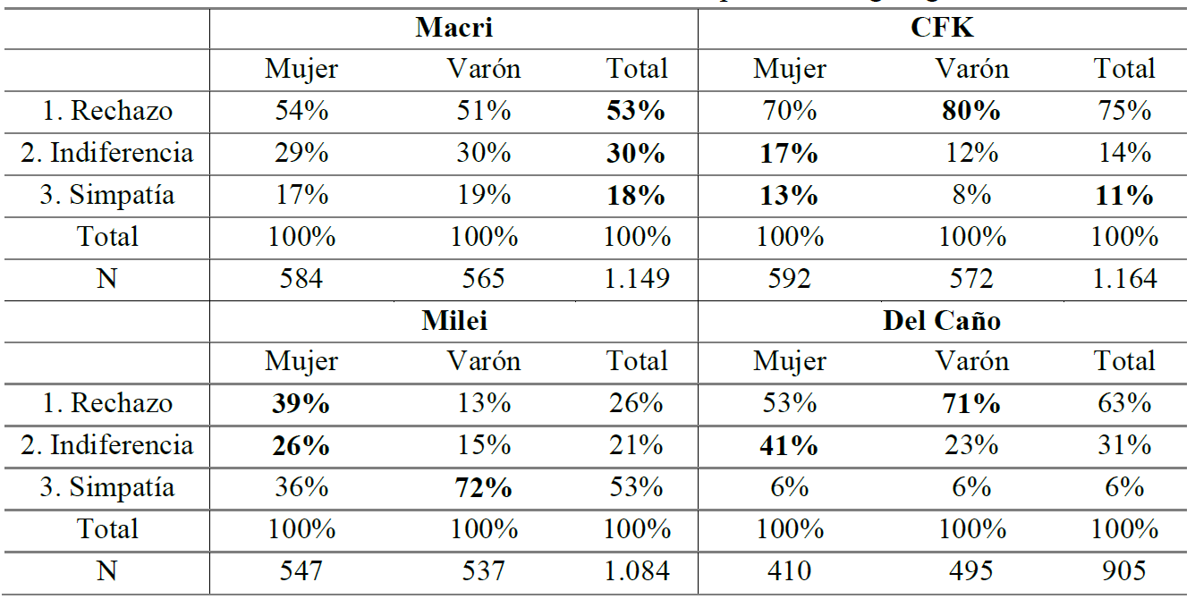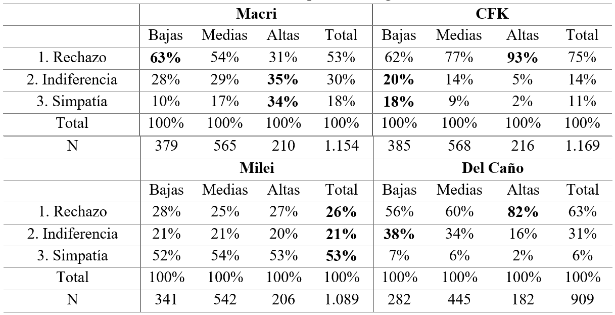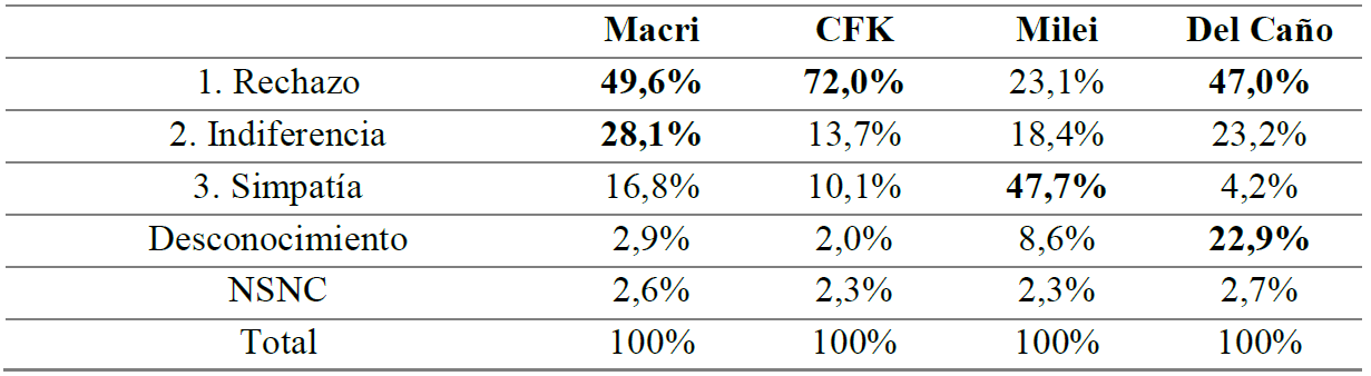 Al igual que en la tabla anterior, en todos los casos el rechazo político es mayor que la simpatía política, excepto para Milei. En Macri el rechazo es de 49,6% (+15,7 p.p. que el de su espacio partidario), la indiferencia del 28,1% (-4 p.p.) y la simpatía de 16,8% (+0,9 p.p.). En CFK el rechazo es 71,9% (+26,6 p.p.), la indiferencia 13,7% (-12,5 p.p.) y la simpatía 10,1% (+4,6 p.p.). En Del Caño el rechazo es 47,0% (+3,5 p.p.), la indiferencia 23,2% (+0,4 p.p.) y la simpatía del 4,2% (+0,8 p.p.). En cambio, en Milei el rechazo es de 23,0% (+4,4 p.p.) y la indiferencia del 18,4% (-2,3 p.p.), mientras que la simpatía es del 47,6% (+20,4 p.p.).