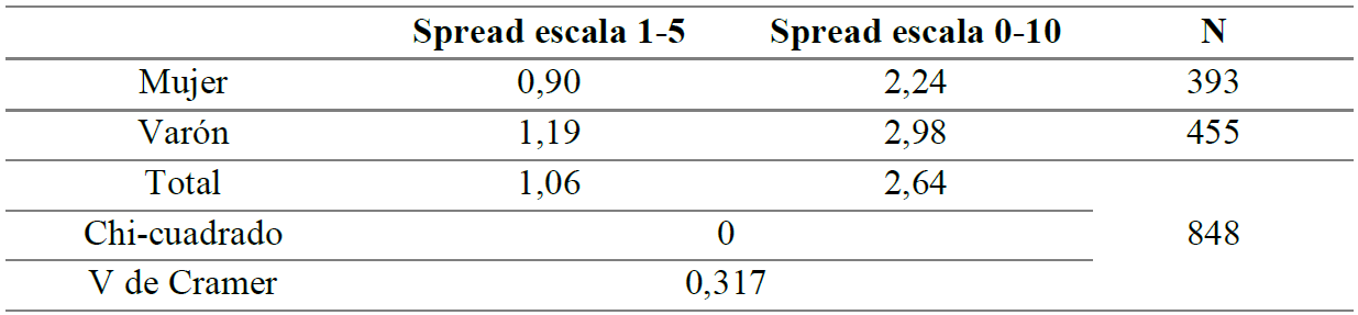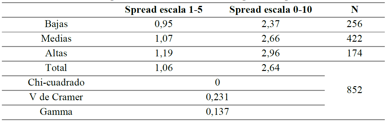 Por un lado, la Tabla 4 muestra que el spread de polarización afectiva se ve modificado por el género; es una asociación significativa (es posible rechazar la hipótesis nula porque la significación del coeficiente Chi-cuadrado es igual a cero) y fuerte (V de Cramer=0,317). Es decir, el spread de polarización reescalado (2,64) es mayor entre varones (2,94) que entre mujeres (2,24). Por otro lado, en la Tabla 5 se aprecia que el spread de polarización también es alterado por la condición de clase, pero en menor medida; es una asociación significativa (Chi-cuadrarlo=0) y positiva (Gamma=0,137). Es decir, el spread de polarización reescalado (2,64) es mayor entre jóvenes de clases altas (2,96) que de clases medias (2,66) y bajas (2,37). En suma, este contexto de estudio enseña un nivel medio de polarización afectiva, que se ve modificado por dos variables sociológicas clásicas; es mayor entre varones que entre mujeres y es mayor entre clases altas que entre clases medias y bajas.