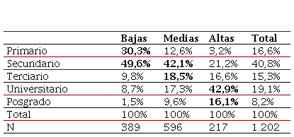 Por último, aquí se consideran dos variables sociológicas clásicas como variables independientes: género y condición de clase. La variable género se construyó a partir de la siguiente pregunta del cuestionario: ¿Cuál es tu género? Marcá una sola opción: 1) Mujer; 2) Varón; 3) Otro[9]. Para la variable condición de clase, se construyó una variable de tres categorías (clases bajas, clases medias y clases altas), considerando las modalidades de estratificación del sistema escolar (Gamallo 2015), que coinciden con indicadores de capital cultural (nivel educativo del núcleo familiar) y capital económico (ocupación del núcleo familiar), tomando la propuesta metodológica de Pierre Bourdieu (1979) en línea con trabajos previos (Kriger y Dukuen 2012)[10]. La Tabla 1 muestra que el nivel educativo es mayor a medida que se pasa de clases bajas a medias y a altas: en las escuelas de clases bajas el 79,9% de las madres posee estudios primarios o secundarios; en las escuelas de clases medias el 60,6% de las madres posee estudios secundarios o terciarios; en las escuelas de clases altas el 59% de las madres posee estudios universitarios o de posgrado. Y esta asociación entre condición de clase y nivel educativo es estadísticamente significativa, fuerte y positiva.[11]