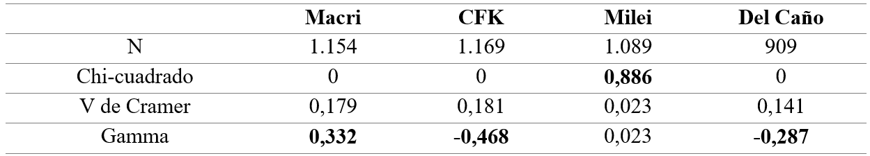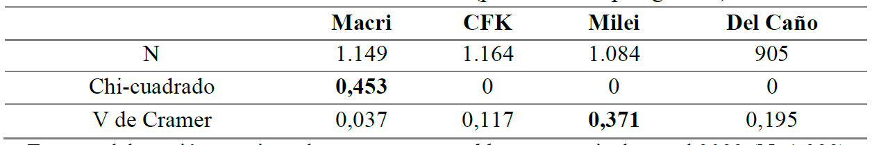 Como muestra la Tabla 7, todas las asociaciones entre polarización afectiva (de CFK, Milei y Del Caño) son estadísticamente significativas en relación con el género, excepto en el caso de Macri (la significación del Chi-cuadrado es 0,453 y no es posible rechazar la hipótesis nula). Así, en la Tabla 6 se observa que la modificación por género de la distribución de la polarización afectiva de Macri no es estadísticamente significativa (esto es, se mantiene el rechazo en torno al 53%, la indiferencia en 30% y la simpatía en 18%).