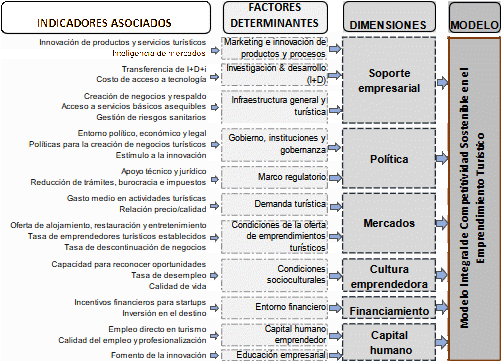 El modelo sistémico de Garcia (2022) está diseñado para evaluar la competitividad y la sostenibilidad del emprendimiento en el sector turístico. Este modelo se basa en seis dimensiones jerarquizadas según su relevancia: soporte empresarial, política, mercados, cultura emprendedora, financiamiento y capital humano. Además, incluye once factores determinantes, tales como marketing e innovación de productos y procesos, investigación y desarrollo (I+D), infraestructura general y turística, gobierno, instituciones y gobernanza, marco regulatorio, demanda turística, condiciones de la oferta de emprendimientos turísticos, condiciones socioculturales, entorno financiero, capital humano emprendedor y educación empresarial; junto con 25 indicadores considerados cruciales.