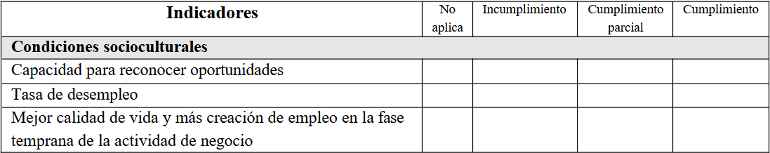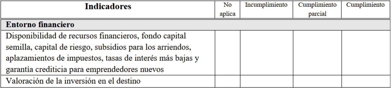 Esta metodología para evaluar las percepciones de los emprendedores sobre el ecosistema propone una estructura para identificar y analizar el grado de cumplimiento los 25 indicadores considerados cruciales, utilizando un sistema de valoración visual basado en el código de colores del semáforo. Este sistema clasifica el cumplimiento de los indicadores de la siguiente manera: