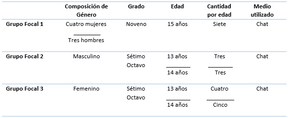 Al inicio, se contactó al colegio Liceo Experimental Bilingüe de Grecia, se pidió conocer los grupos de estudiantes entre trece y quince años con los cuales se podía trabajar, se contactó al personal docente a cargo de dichos grupos y se pidió un espacio en su clase para el grupo de discusión. Se hizo una primera reunión virtual para conocer al equipo investigador e información de la investigación. Posteriormente se hizo la selección y se aplicaron consentimientos y asentimientos informados; se realizó un primer grupo focal de tipo mixto con el grupo de noveno año y posteriormente otros dos grupos separados por género uniendo trece y catorce años. Se obtuvo un grupo mixto de siete, un grupo femenino de nueve y un grupo masculino de seis.