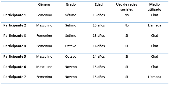 Las personas participantes debían tener descargado Teams (aplicación utilizada en la institución para brindar las clases virtuales) y una aplicación para firmar documentos en línea llamada Signply, así como tener algún dispositivo electrónico para utilizar la aplicación. Debían tener entre trece y quince años de edad, vivir en La Gran Área Metropolitana de Costa Rica, no conocer al equipo investigador para evitar sesgos de información y poseer el consentimiento y asentimiento informado firmados. Se conformaron grupos focales y luego se eligieron a algunas personas para participar en entrevistas individuales, las cuales reportaban conocimientos y vivencias sobre el acoso sexual en línea, ya sea en experiencias propias o de forma vicaria, haber realizado varios aportes con capacidad de verbalización y abstracción, así como disposición de brindar números de contacto, consentimiento y asentimiento firmado que demostraran deseos de participar.