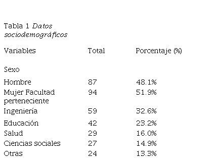 Para calcular el tamaño de la muestra se utilizó el Software GPower con parámetros a priori para un contraste de una cola, un tamaño de efecto de 0.25, una probabilidad de error alfa de 0.05 y un poder de 0.95, obteniendo una muestra mínima de 164 participantes. Véase tabla 1. Finalmente, la encuesta fue respondida por 181 estudiantes de educación terciaria, pertenecientes a diversas instituciones educacionales tanto de Institutos profesionales, Centros de formación técnica y Universidades con un promedio de edad de 21 años (DE= 3.09). La muestra está constituida con el 48.1% de hombres (n=87) y con el 51.9% de mujeres (n=94), de los cuales distribuido por facultad el 32.6% pertenecen a Ingeniería (n=59), un 23.2% pertenecen al área de la Educación (n=42), un 16.0% del área de la Salud (n=29), un 14.9% del área de las Ciencias Sociales (n=27) y el 13.3% pertenecían a otras áreas (n=24).